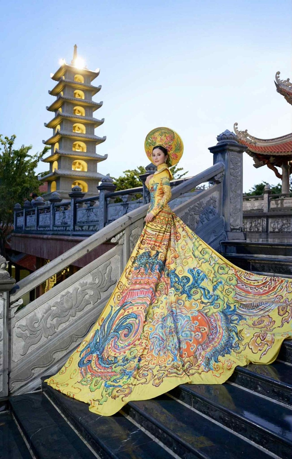 Trong bộ sưu tập mới, bốn mẫu áo dài được trình làng tượng trưng cho bốn yếu tố cốt lõi của văn hóa Việt: Tâm linh – Sức mạnh – Phồn vinh – Nghệ thuật. Chất liệu chính là lụa tơ tằm, gấm thượng hạng, chỉ ánh kim, hạt pha lê và kỹ thuật vẽ sơn dầu thủ công – tất cả cùng hòa quyện trong bàn tay của người nghệ sĩ để tạo nên một bản sắc thời trang đậm hồn Việt.