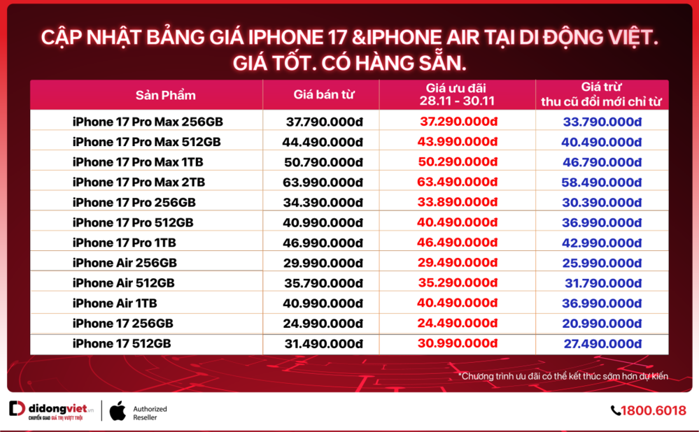 Độc giả có nhu cầu tham khảo, lên đời ngay iPhone 17 Pro, iPhone 17 Pro Max, iPhone Air hoặc mua các sản phẩm di động, đồ gia dụng thông minh, xe máy điện có thể tìm hiểu thêm tại website: didongviet.vn, hoặc gọi tổng đài 1800.6018 (miễn phí).