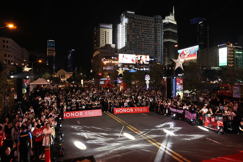 HONOR đã lựa chọn cách thức ra mắt X9d vô cùng riêng biệt, sáng tạo khi biến buổi giới thiệu sản phẩm thành một đêm đại nhạc hội bùng nổ ngay tại Phố đi bộ Nguyễn Huệ, thu hút hàng nghìn bạn trẻ đến giao lưu và gặp gỡ các “thần tượng”.