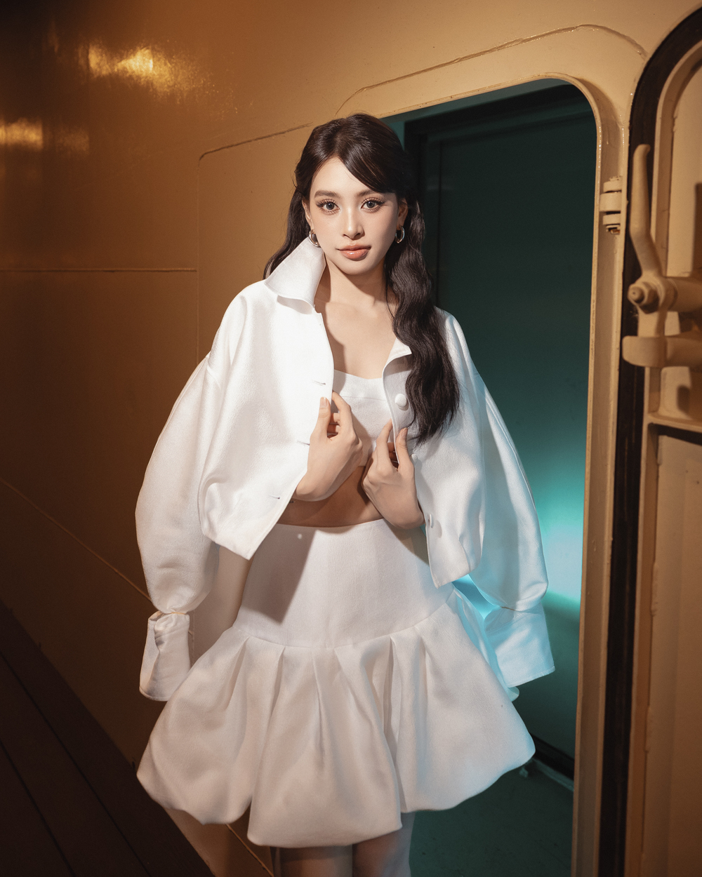 Hoa hậu Tiểu Vy xuất hiện với set váy trắng mang phong cách tiểu thư.