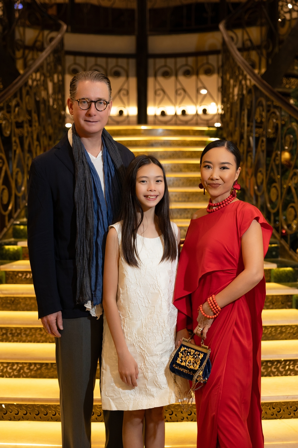 Vợ chồng ca sĩ Đoan Trang và con gái tham dự đêm tiệc.