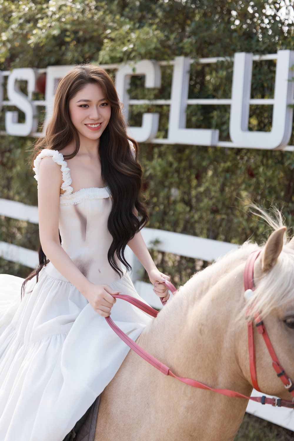 Ở khung hình diện váy trắng, nàng hậu toát lên vẻ mềm mại, tinh khôi khi sải bước cùng ngựa. Trong khi đó loạt hình với trang phục chuyên dụng dành cho cưỡi ngựa: phom dáng gọn gàng, boots cao lại tạo nên tổng thể khỏe khoắn và dứt khoát và tràn đầy sức sống. Sự đối lập này không chỉ tạo nên hiệu ứng thị giác mà còn góp phần khắc họa rõ nét tinh thần mà nàng hậu theo đuổi: vẻ đẹp không chỉ đến từ ngoại hình mà còn từ ý chí và sự rèn luyện.