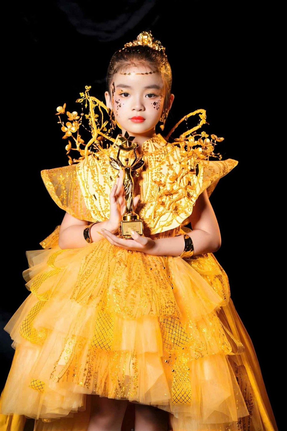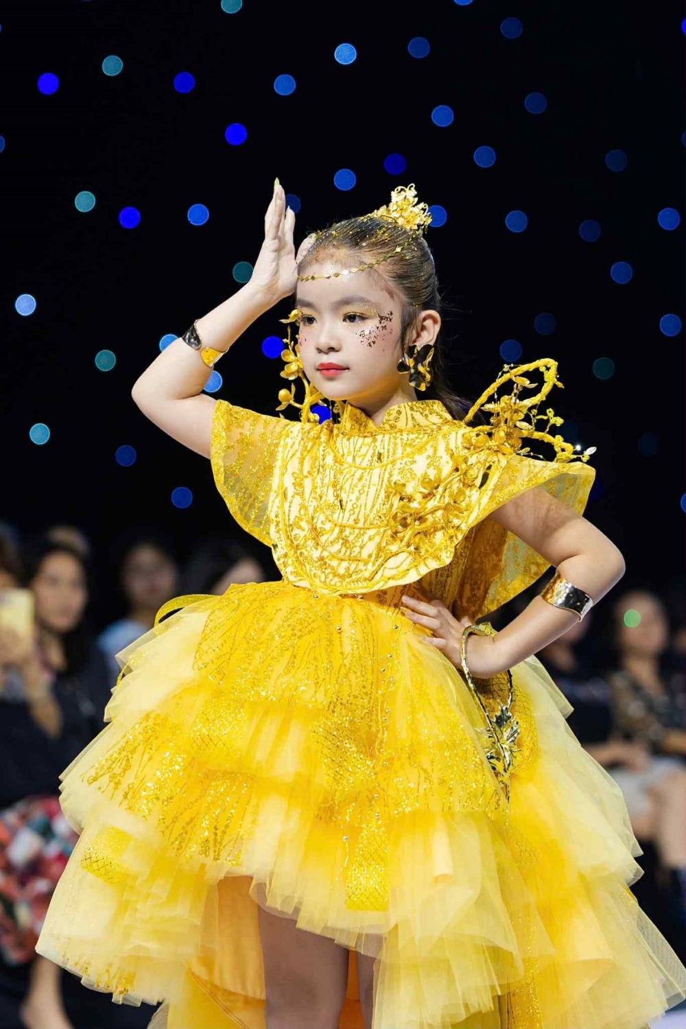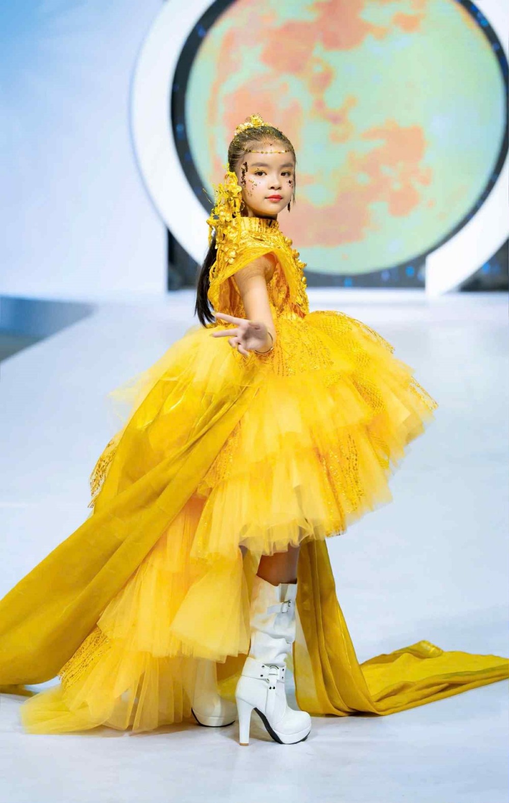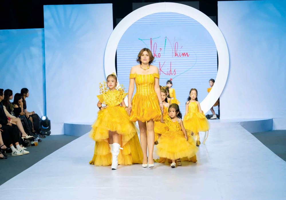 Những thiết kế dành riêng cho trẻ em được may từ vải tơ óng mềm mại tạo hiệu ứng uyển chuyển, nhẹ nhàng như những nàng công chúa bước ra từ truyện cổ tích. Gam màu vàng chủ đạo không chỉ tôn vinh nét rực rỡ, kiêu sa mà còn mang ý nghĩa may mắn, ấm áp. Với sự kết hợp tinh tế giữa kỹ thuật may đo hiện đại và vẻ đẹp truyền thống, NTK Thanh Liễu cùng mẫu nhí Nguyễn Cao Vân khép màn trình diễn đầy ấn tượng, tỏa sáng nét đẹp hồn nhiên và trong trẻo của các thiên thần nhỏ.