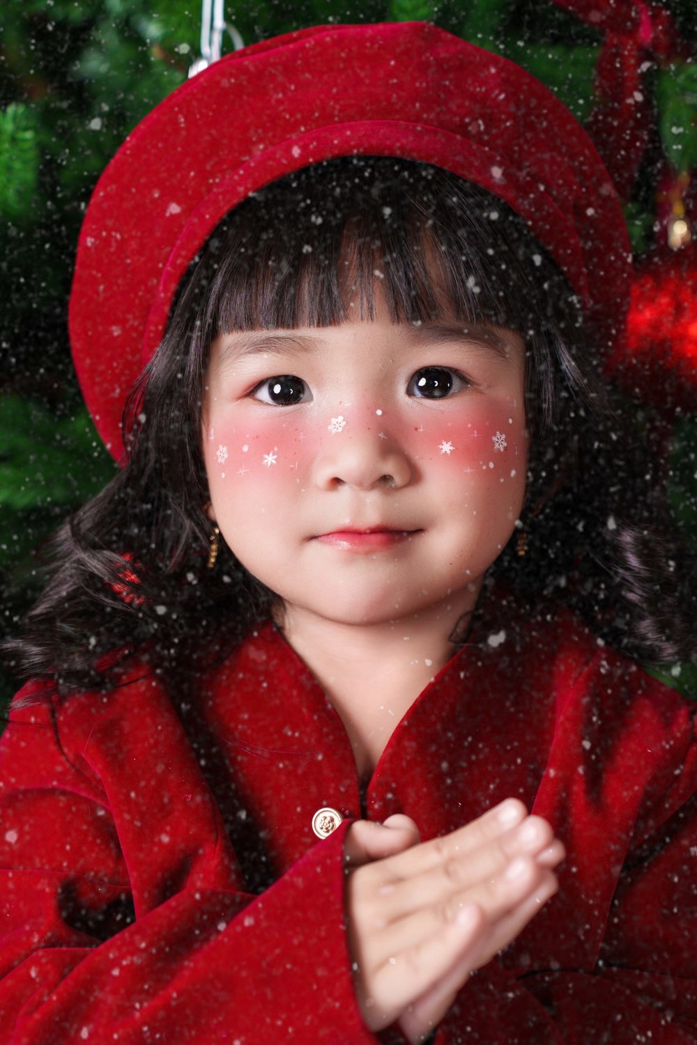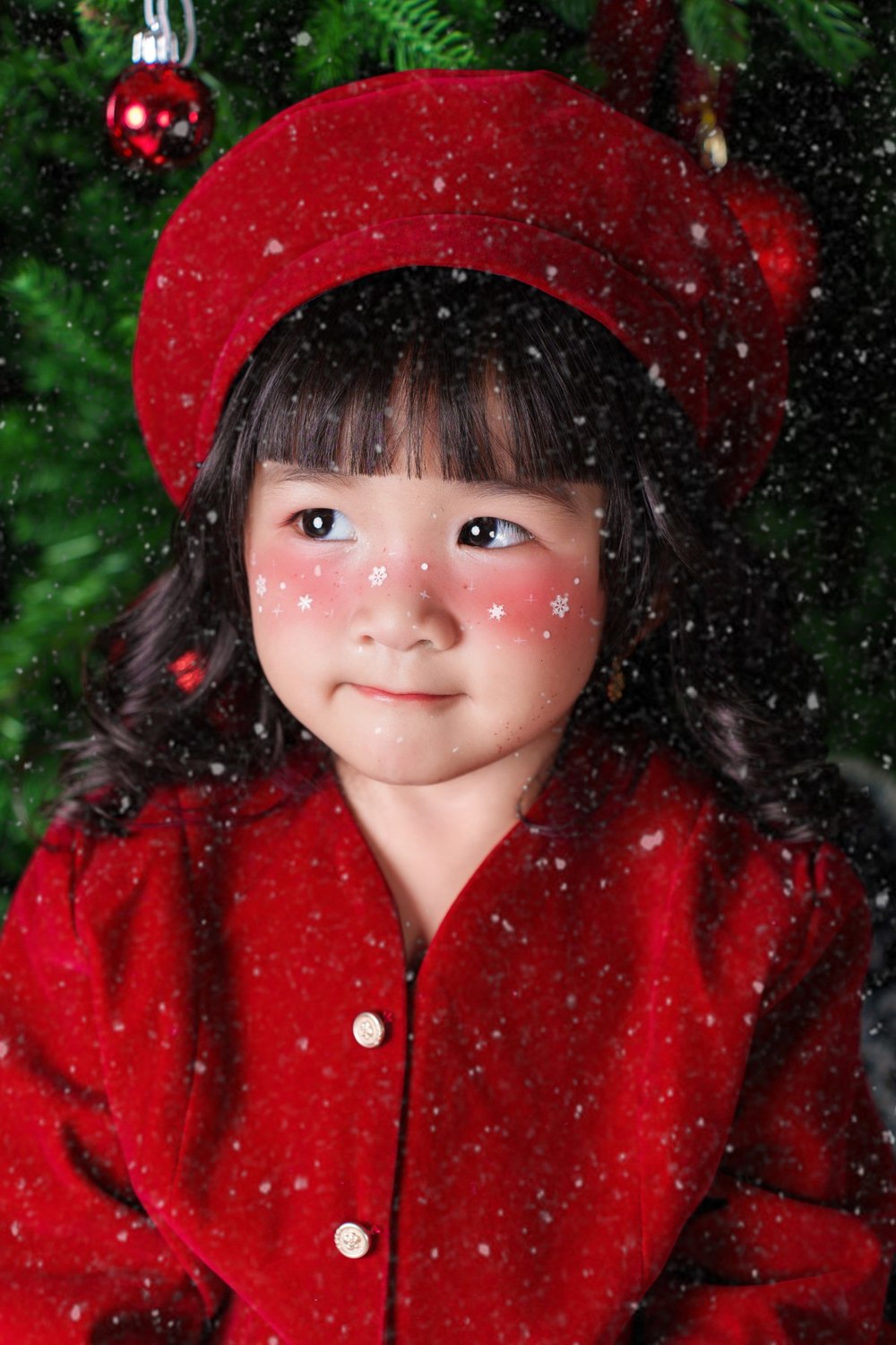 Sang bộ ảnh thứ hai, Candy gây ấn tượng với tạo hình đỏ rực rỡ – gam màu biểu trưng cho mùa lễ hội. Bộ trang phục nhung đỏ kết hợp mũ beret đồng điệu giúp em trông vừa đáng yêu vừa nổi bật. Chi tiết quả châu đỏ lấp lánh được Tú Uyên nâng niu trong tay, cùng hiệu ứng tuyết rơi nhẹ. Nụ cười tươi tắn, ánh nhìn tự tin của Tú Uyên khiến khung hình trở nên sống động, giàu cảm xúc.