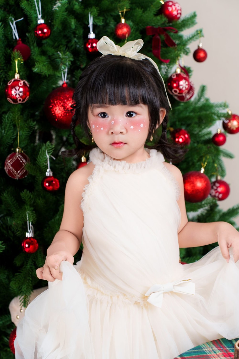 Ở trang phục đầu tiên, Tú Uyên xuất hiện trong chiếc váy trắng, chất liệu mềm nhẹ, tạo độ bồng bềnh vừa phải. Mái tóc tết gọn gàng, điểm nơ sáng màu càng làm nổi bật gương mặt, đôi mắt trong veo. Tổng thể khung hình mang gam màu lễ hội, gợi cảm giác ấm áp và bình yên – đúng tinh thần của giáng sinh sum vầy.