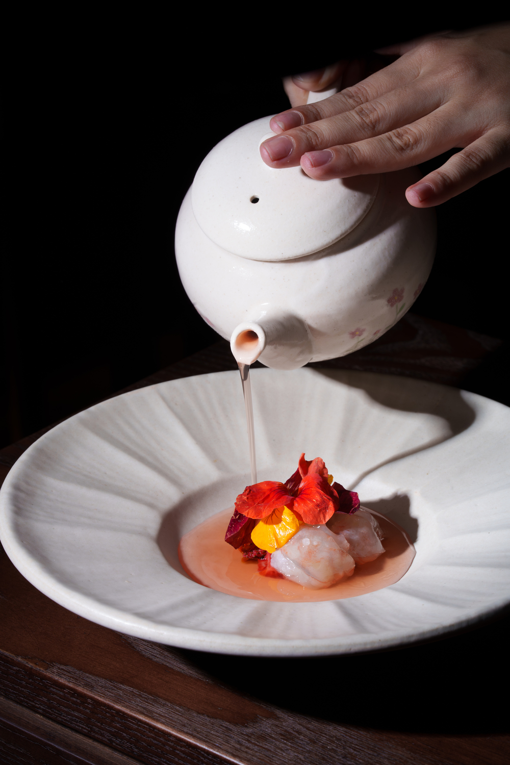 Hành trình bắt đầu với chương Ươm Mùa (Cultivating the Season), tập trung vào sự tươi mới của các nguyên liệu như cá bóp Nha Trang, bòn bon hay sò điệp Hokkaido để đánh thức vị giác bằng sự tiết chế và tinh tế. Tiếp nối là Vào Nếp (Into Structure), giai đoạn chuyển tiếp khi các hương vị bắt đầu có sự kết nối và cấu trúc rõ nét hơn thông qua tôm hùm bông, mực lá Phan Thiết, cá tráp Nhật Ehime.