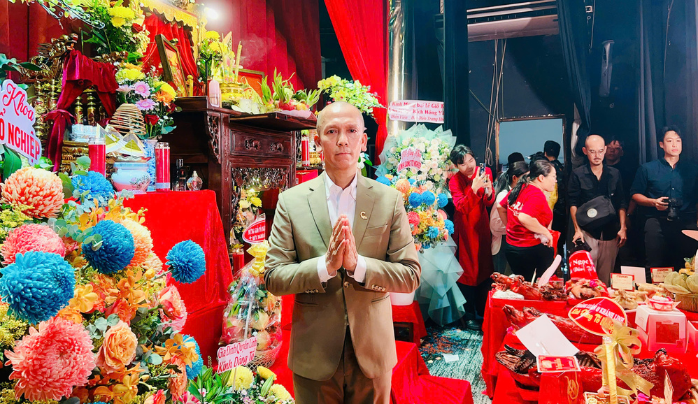 Nghệ sĩ Saxophone Minh Tâm Bùi diện vest lịch lãm, thành kính dâng lên hoa quả kính Tổ nghiệp. Anh chia sẻ: "Cứ vào giữa rằm tháng 8 âm lịch là anh em nghệ sĩ chúng tôi tề tụ về ngôi nhà Tổ Nghiệp. Tôi xin kính dâng lên Tổ nén hương với lòng biết ơn vô bờ bến mà Tổ luôn sáng đèn sân khấu và luôn gia hộ cho anh em nghệ sĩ chúng tôi làm nghệ thuật chân chính để phục vụ khán giả nước nhà. Và tôi cũng cầu mong Tổ cho tôi và tất cả anh em nghệ sĩ được sức khoẻ dồi dào, giữ lửa đam mê với nghề nhiều sáng tạo ca hay, diễn giỏi để có thật nhiều show và nhận được thành công lớn, được khán giả khắp nơi yêu thương ủng hộ, cống hiến cho nghệ thuật nước nhà. Tôi luôn mang trong lòng sự kính ơn Tổ nghiệp thật nhiều! Cảm ơn NSND Hồng Vân và tất cả các bầu show tổ chức chương trình đã luôn yêu thương và tạo điều kiện cho tôi được đồng hành hoạt động nghệ thuật!"