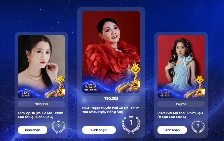 Trái ngược với sự 'thống lĩnh' của Top 1 bảng Nam, bảng Nữ diễn viên được yêu thích nhất lại trở thành tâm điểm chú ý của mùa giải năm nay. Phương Mỹ Chi và Đoàn Thiên Ân là 2 đề cử liên tục bám sát nhau về lượng bình chọn, tạo nên màn rượt đuổi căng thẳng với nhiều lần đổi vị trí top 1 - top 2 chỉ trong thời gian ngắn. Cuộc so kè này không chỉ phản ánh mức độ yêu thích gần như ngang bằng của khán giả dành cho hai gương mặt trẻ, mà còn cho thấy sức nóng thực sự của chặng nước rút trước thời điểm đóng cổng bình chọn.