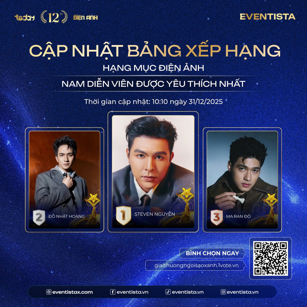 Ở hạng mục Điện ảnh, bảng xếp hạng Nam diễn viên được yêu thích nhất vẫn cho thấy sự ổn định rõ nét. Steven Nguyễn tiếp tục giữ vị trí dẫn đầu suốt nhiều tuần liên tiếp với vai diễn trong Mưa Đỏ, tạo khoảng cách an toàn so với các đề cử bám đuổi phía sau. Phong độ bền bỉ này cho thấy sức hút ổn định của vai diễn cũng như sự ủng hộ mạnh mẽ từ cộng đồng khán giả.