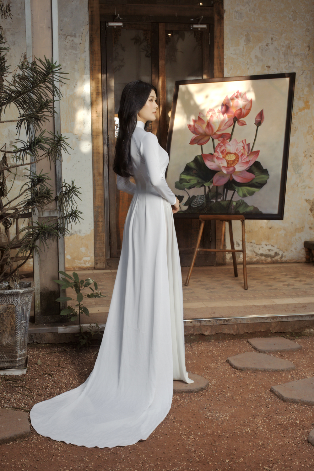 Trong bộ ảnh, Phúc Anh lựa chọn áo dài trắng với thiết kế tối giản nhưng tinh tế, lấy cảm hứng từ vẻ đẹp truyền thống của người phụ nữ Việt Nam. Phom dáng áo dài mềm mại, chất liệu nhẹ nhàng, đường cắt thanh thoát giúp tôn lên nét dịu dàng, kín đáo mà không kém phần hiện đại. Hình ảnh Phúc Anh trong tà áo dài trắng gợi lên vẻ đẹp dịu dàng, ấm áp và gần gũi.