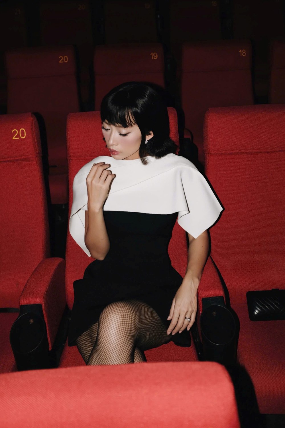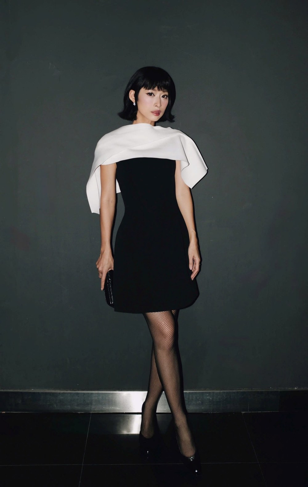 Diện thiết kế đen – trắng thanh lịch, cùng mái tóc ngắn nhẹ ôm khuôn mặt, Quỳnh Thy khiến khán giả liên tưởng đến hình ảnh Audrey Hepburn hiện đại – vừa cổ điển, vừa tinh tế. Cô chọn layout trang điểm nhẹ nhàng, tôn lên đường nét mềm mại và ánh nhìn dịu dàng nhưng vẫn đầy thần thái. Phong cách tối giản nhưng được trau chuốt kỹ lưỡng giúp nữ diễn viên toát lên khí chất thanh lịch hiếm thấy giữa một sự kiện đầy sắc màu.