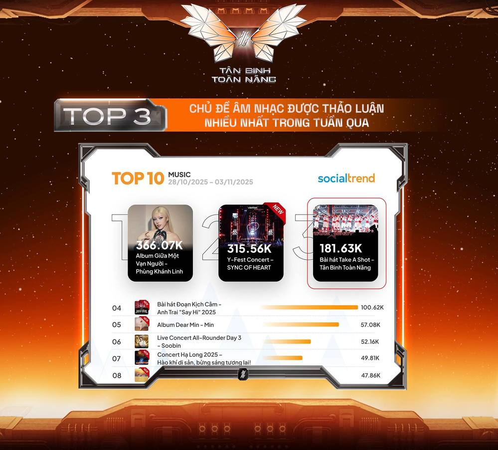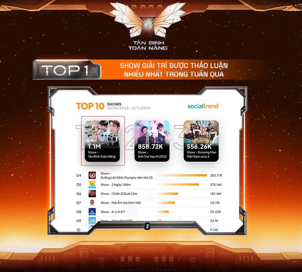 Tuần qua Tân binh toàn năng đạt thành tích mới với 1,1 triệu lượt thảo luận, chính thức giữ vững vị trí Top 1 BXH SocialTrend Ranking Shows của YouNet Media (tuần 28/10 – 03/11/2025).