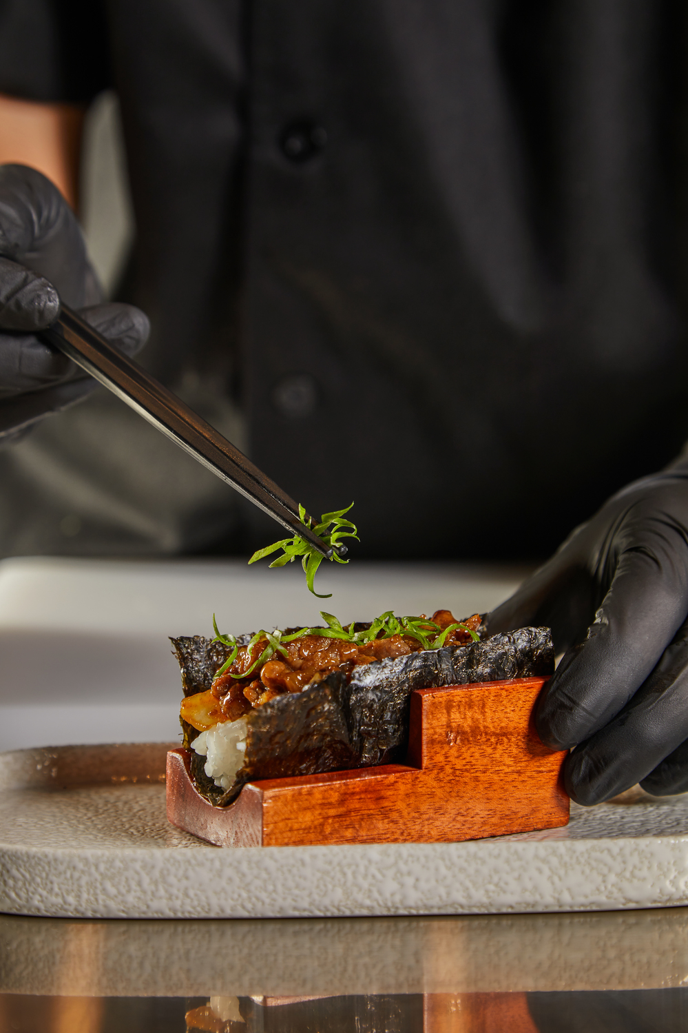 Điểm nhấn không thể bỏ lỡ còn phải kể đến Sushi Handroll (sushi cuộn cầm tay) – xu hướng ẩm thực từng “gây bão” tại Bangkok năm 2025. Với lựa chọn nhân đa dạng từ cá ngừ cay nồng đến cua lột chiên giòn, thực khách có thể thưởng thức tuỳ chọn (à la carte) hoặc trải nghiệm theo set (handroll flight) để cảm nhận trọn vẹn lớp rong biển giòn tan ôm trọn phần nhân tươi ngon. Trải nghiệm sẽ càng thêm thăng hoa khi dùng kèm các set rượu Sake (Sake Flight) tinh tuyển, khơi dậy vị ngon đậm đà (umami) bùng nổ nhưng hài hòa, cân bằng.